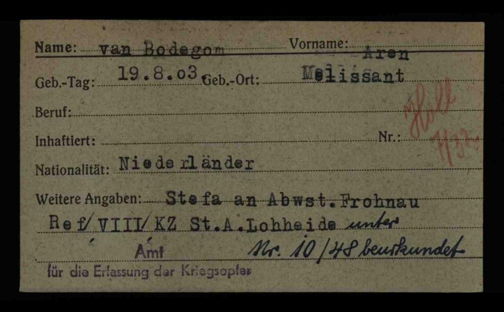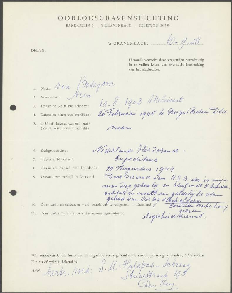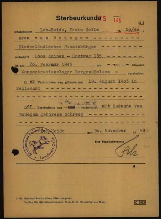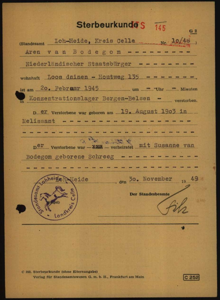 Aren heeft geen bekend graf en wordt herdacht in het Gedenkboek te Bergen-Belsen.