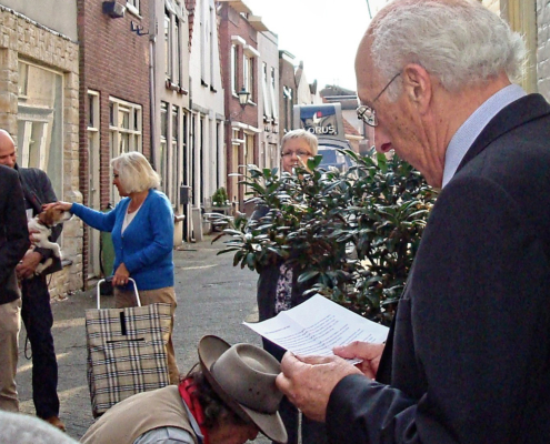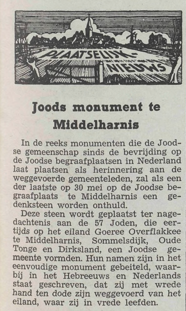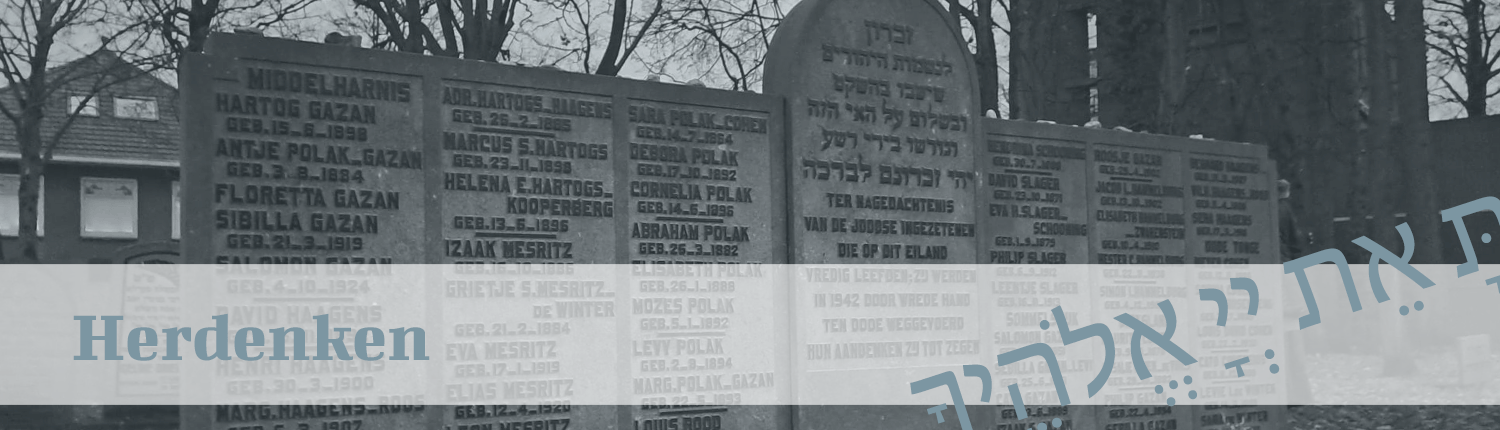 De Holocaust herinneren – hoe doe je dat als de enkele overlevenden de woorden niet weten te vinden en de omstanders niet luisteren? In de eerste jaren na de oorlog was er weinig aandacht voor het lot van de Joodse eilandbewoners. In 1957 liet de Joodse Jacques Hartogs op de Joodse begraafplaats te Middelharnis een – door nabestaanden grotendeels zelf gefinancierd – monument plaatsen. In de 21e eeuw werden de Joodse begraafplaatsen in Goedereede en Dirksland opgeknapt en van een informatiebord voorzien. Op initiatief van dhr. De Man uit Dirksland realiseerde het Paul van Hessenfonds de zgn. Stolpersteine (struikelstenen) voor alle Joodse slachtoffers op Goeree-Overflakkee.